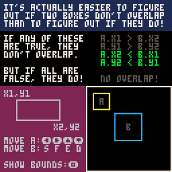 Notes: This cart uses a function called overlap(a,b) to determine if the player has run into a pickup. Use the Checking For Overlap