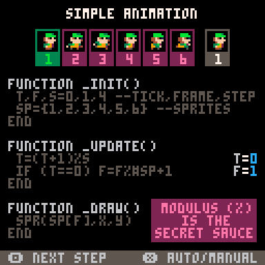 function _init() p={} --player p.t,p.f,p.s=0,1,4 --tick,frame,step p.sp={1,2,3,4,5,6} --sprites end function _update() animate(p) end function _draw() spr(p.sp[p.f],x,y) end --animate an object function animate(o) o.t=(o.t+1)%o.s --tick fwd if (o.t==0) o.f=o.f%#o.sp+1 end
